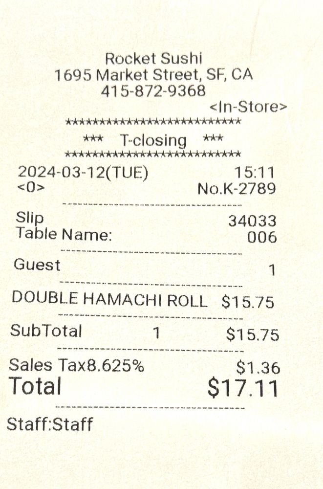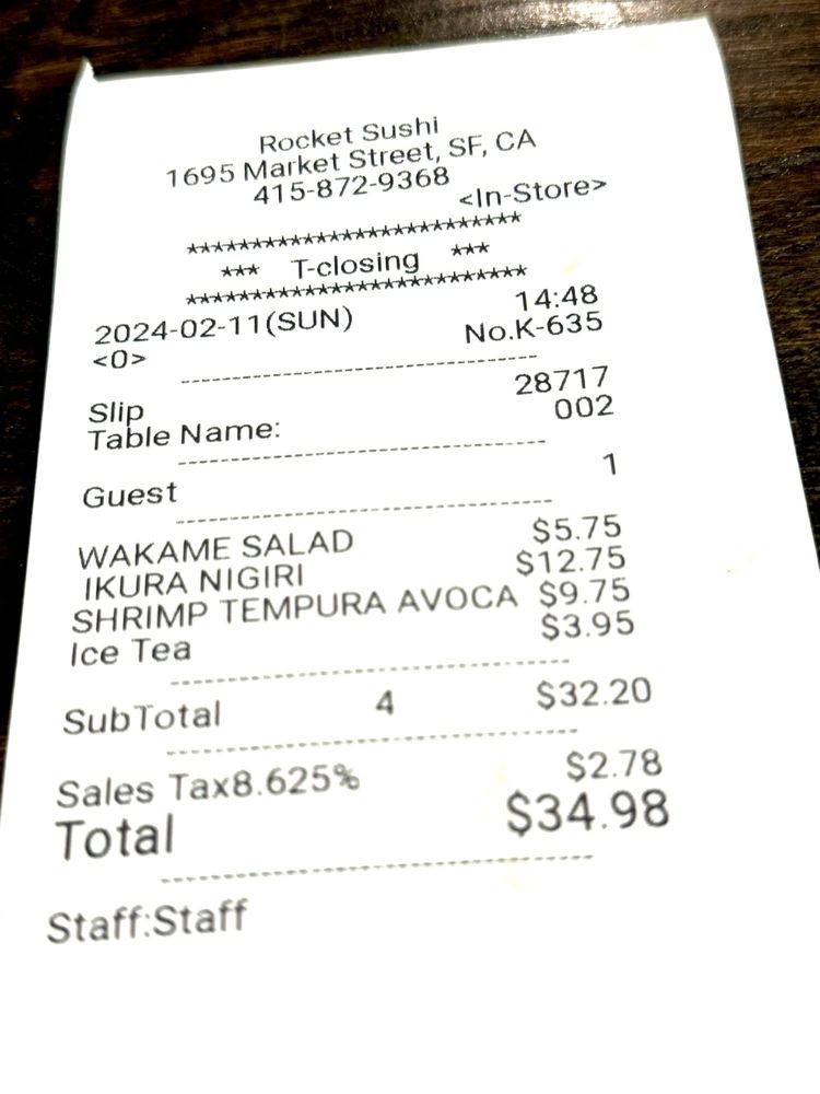 Rocket Sushi, located at 1695 Market St in San Francisco, is a standout in the Ramen - Sushi Bars category. This Asian and women-owned restaurant offers a unique dining experience with its rocket tray delivery system. Customers rave about the freshness and tastiness of the sushi, with standout dishes like the sweet potato roll and yellowtail scallion roll. The service is fast and efficient, and the ambience is lively and welcoming. With a wide range of options for vegetarians, vegans, and those with soy allergies, Rocket Sushi caters to all dietary needs. The prices are reasonable, the portions are generous, and the restaurant is perfect for group gatherings. Whether you're looking for a casual lunch spot or a place to celebrate a special occasion, Rocket Sushi is sure to impress.
